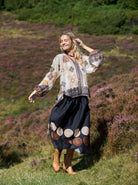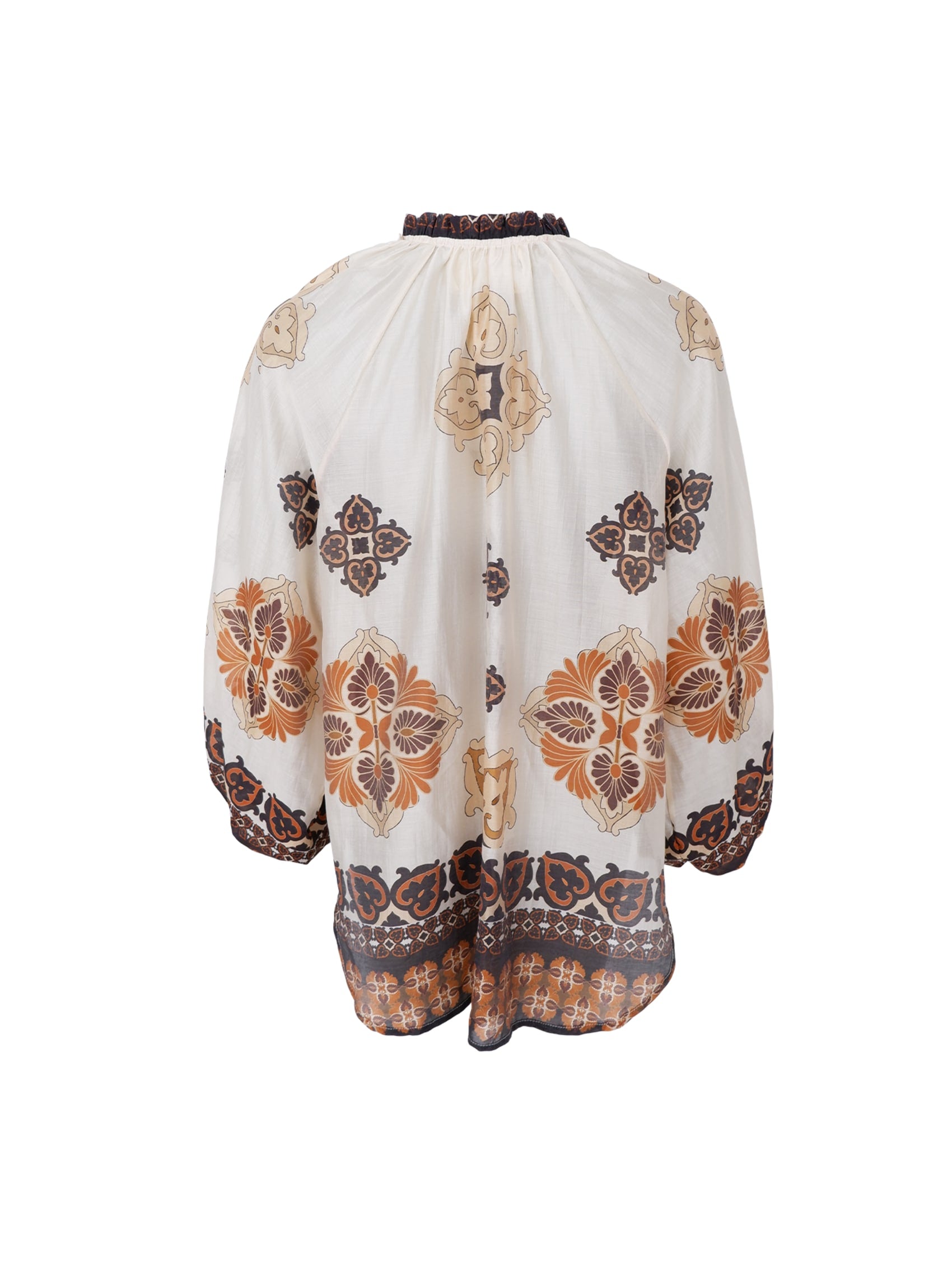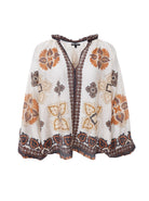 Hayley blusen er en let og luftig bluse med løstsiddende pasform og lange, brede ærmer. Blusen har V-udskæring med smalle bånddetaljer og et dekorativt mønster i varme nuancer, der giver et boheme-inspireret udtryk.