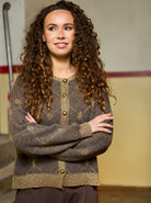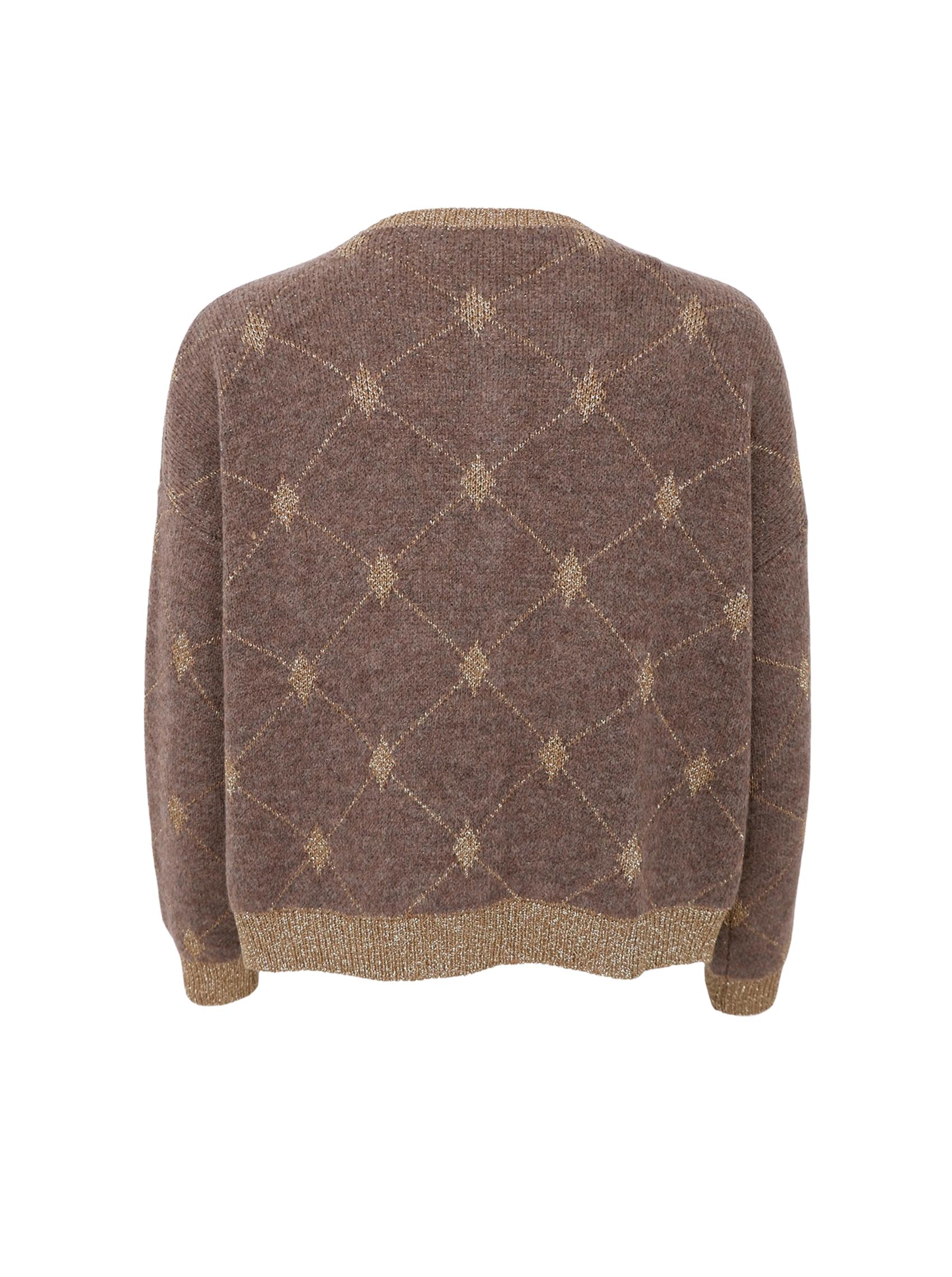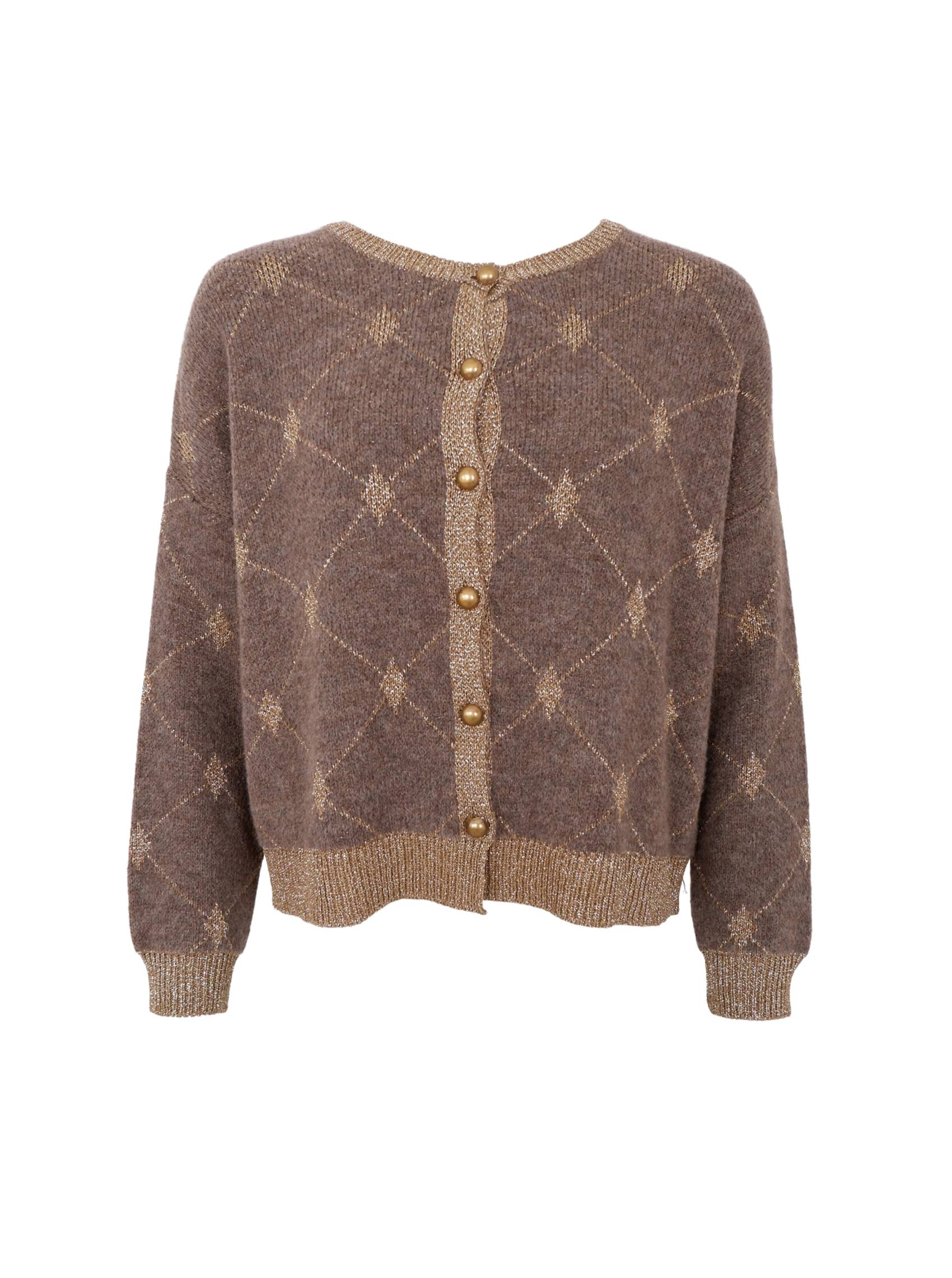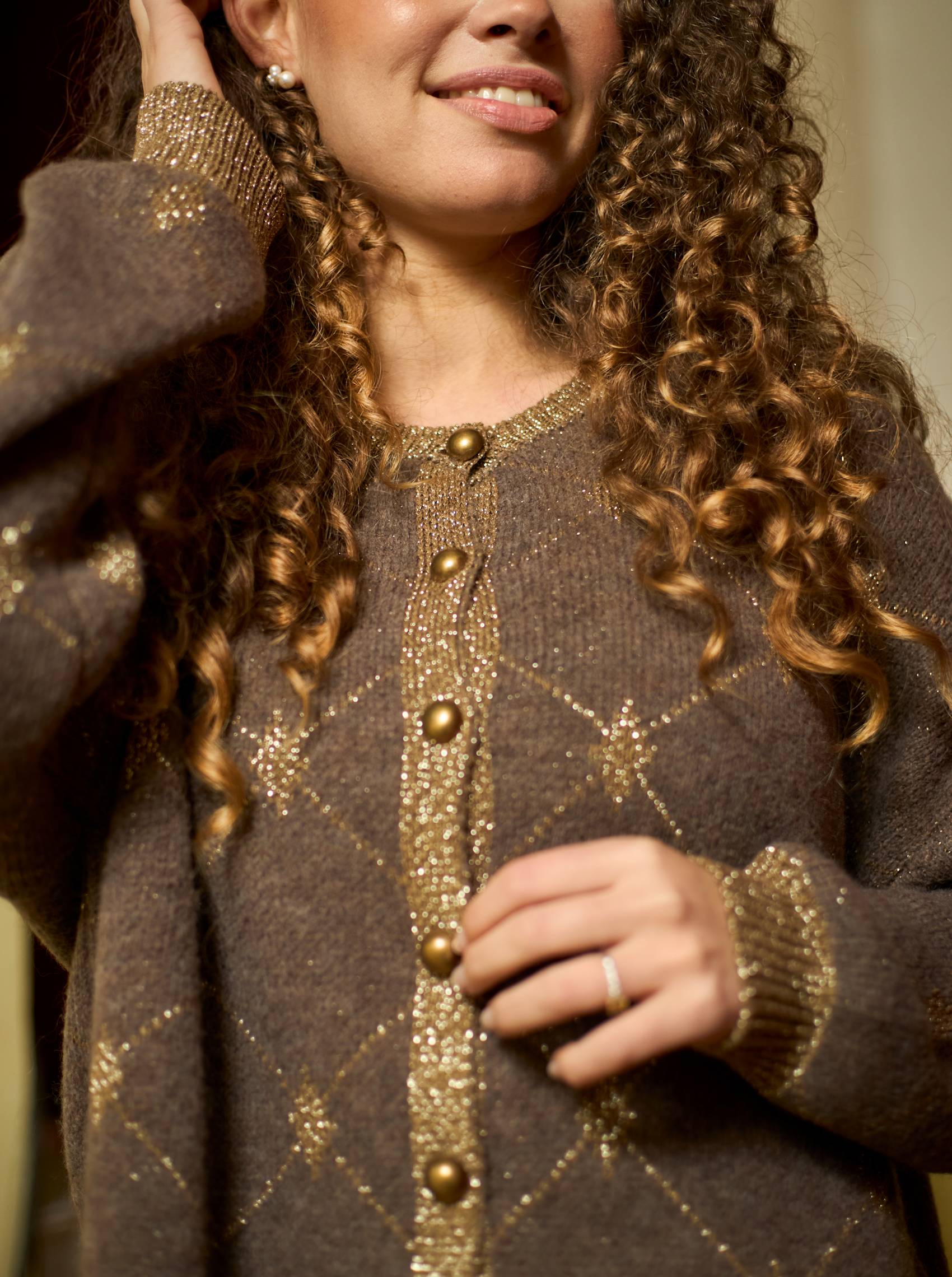 Elegant cardigan i blød strik med diskret mønster og gyldne detaljer. Cardiganen har en klassisk pasform med rund hals, ribkanter og smukke gyldne knapper foran, der giver et feminint og eksklusivt udtryk. Den fine lurextråd i kanterne tilføjer et strejf af glimmer.