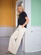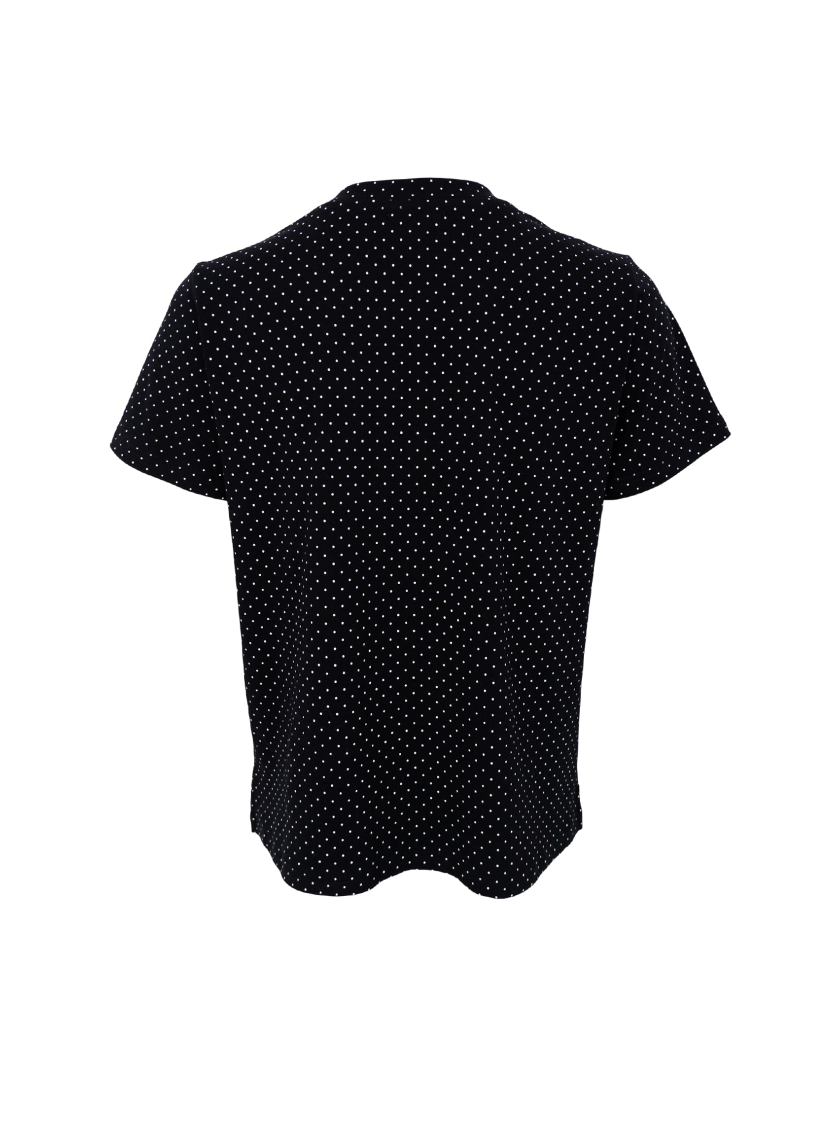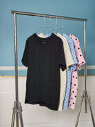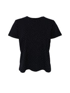 En feminin T-shirt med et klassisk prikmønster og et tidløst, enkelt snit. Modellen har rund hals, korte ærmer og en komfortabel pasform, der gør den ideel til både hverdag og arbejde. Det lette materiale falder flot og giver et afslappet, men stadig pænt udtryk. Perfekt til jeans, nederdele eller under en cardigan for et stilrent og alsidigt look.