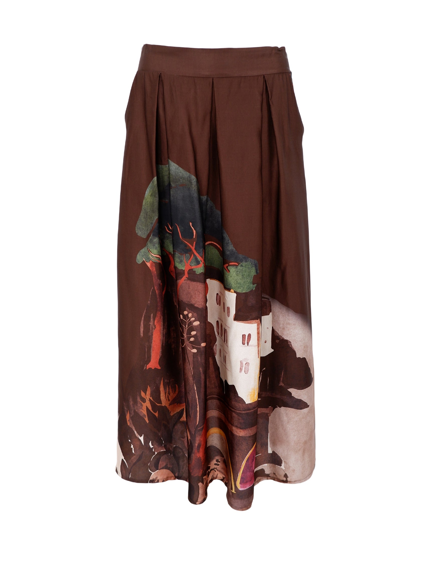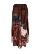 Midi-nederdel i brun nuance med et kunstnerisk print forneden. Nederdelen har en let A-form med brede læg, der giver et smukt fald og elegant bevægelse, samt praktisk og behagelig elastisk i taljen bagpå.