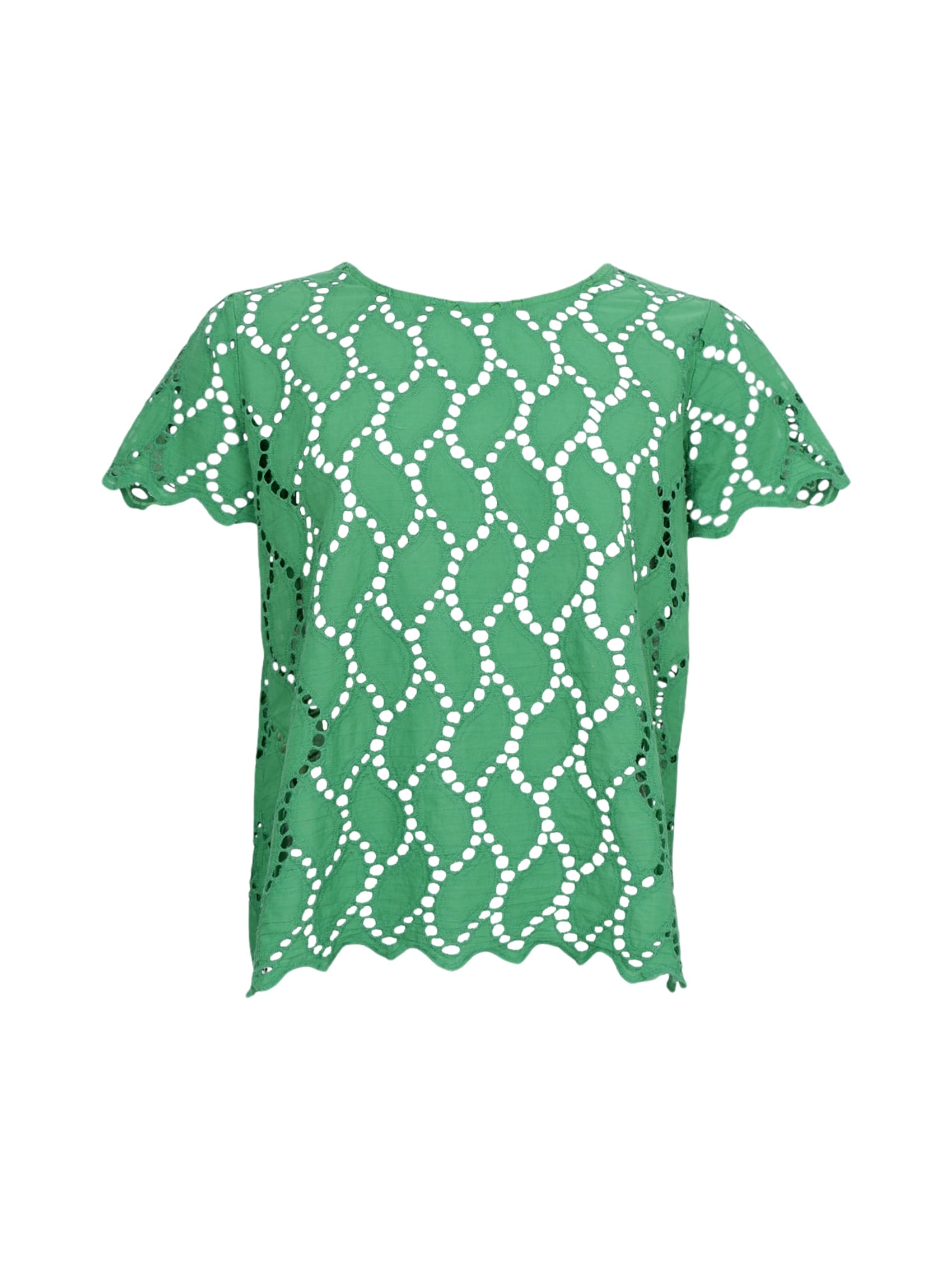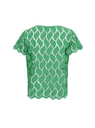 Freya blusen er en elegant kortærmet bluse med rund halsudskæring. Den er fremstillet i et smukt broderet stof med fine udskæringer, der tilføjer et feminint og luftigt udtryk. Blusen har bølget kantafslutning ved både ærmer og bund, hvilket giver et let og sommerligt look.