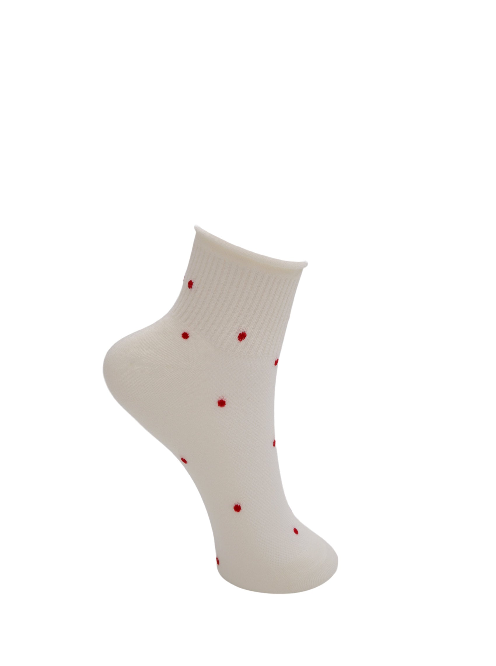 Fin ankelsok med små røde prikker over det hele – en enkel, men charmerende detalje, der gør sokken lidt sjovere.
