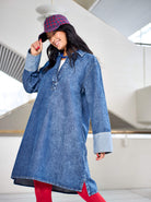 Vores Izzy tunikakjole i denim har et enkelt, lige snit med en afslappet pasform. Modellen er designet med krave og V-formet stolpelukning, som giver et klassisk og rent udtryk. De lange ærmer afsluttes med brede manchetter, der skaber en fin kontrast og tilfører et moderne touch.En alsidig denimkjole, der kan styles alene som kjole eller bruges over bukser og leggings for et mere lagdelt look.