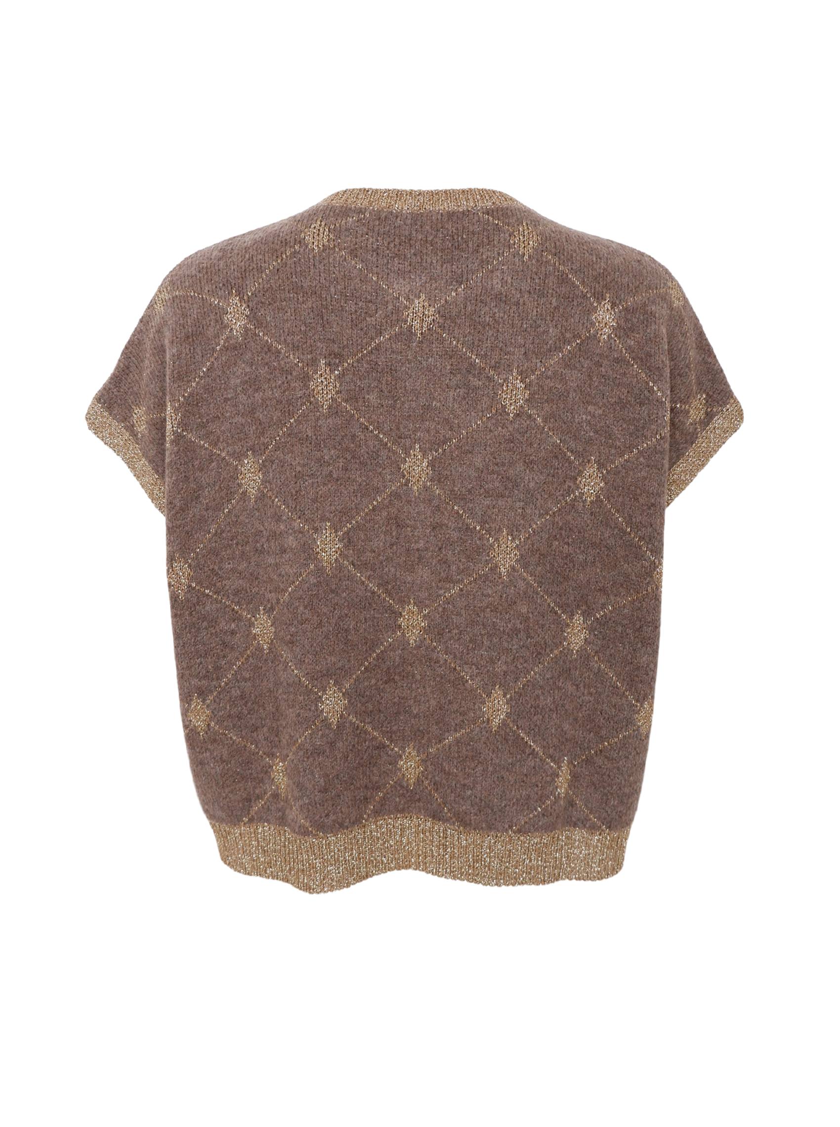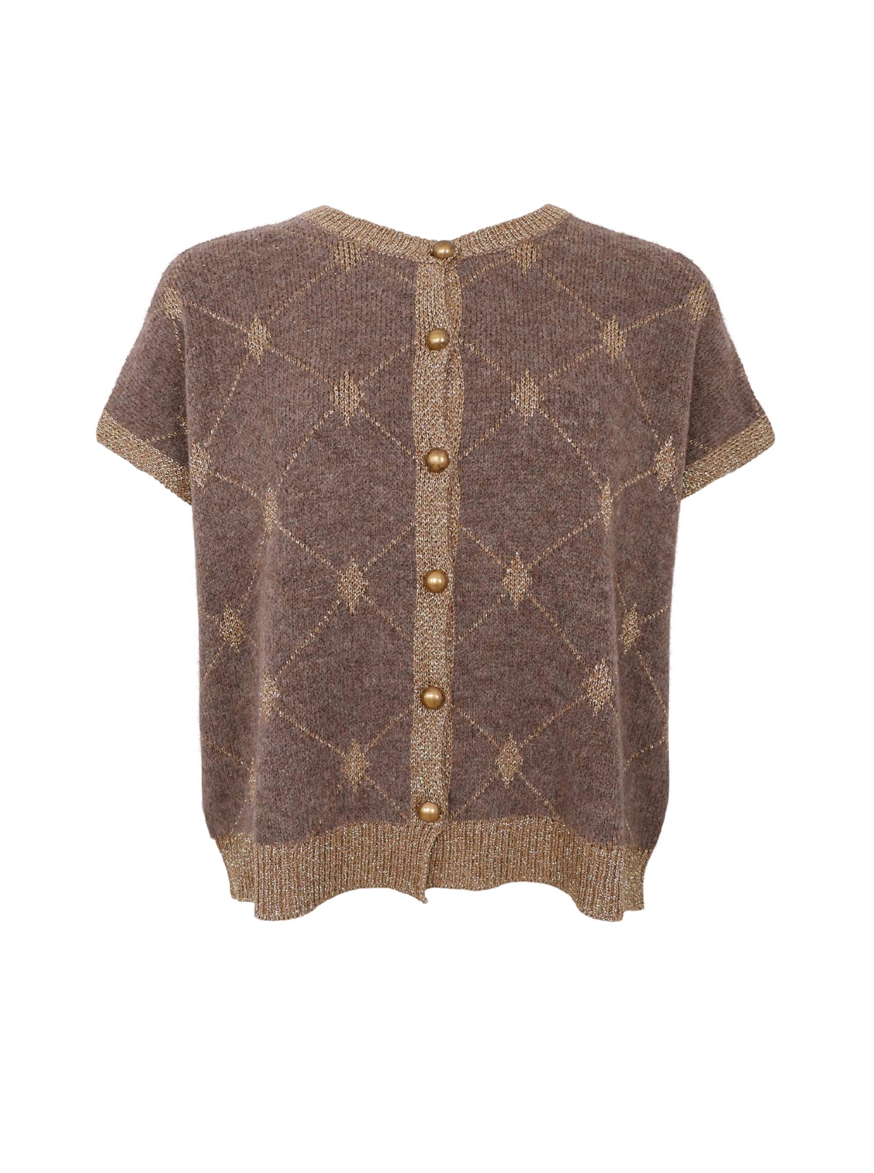 Kortærmet vest i blød strik med elegant mønster og gyldne detaljer. Modellen har rund hals, ribkanter med lurex og smukke gyldne knapper foran, der giver et feminint og luksuriøst udtryk. Den lette kvalitet gør den perfekt til både lag-på-lag styling og som top i sig selv