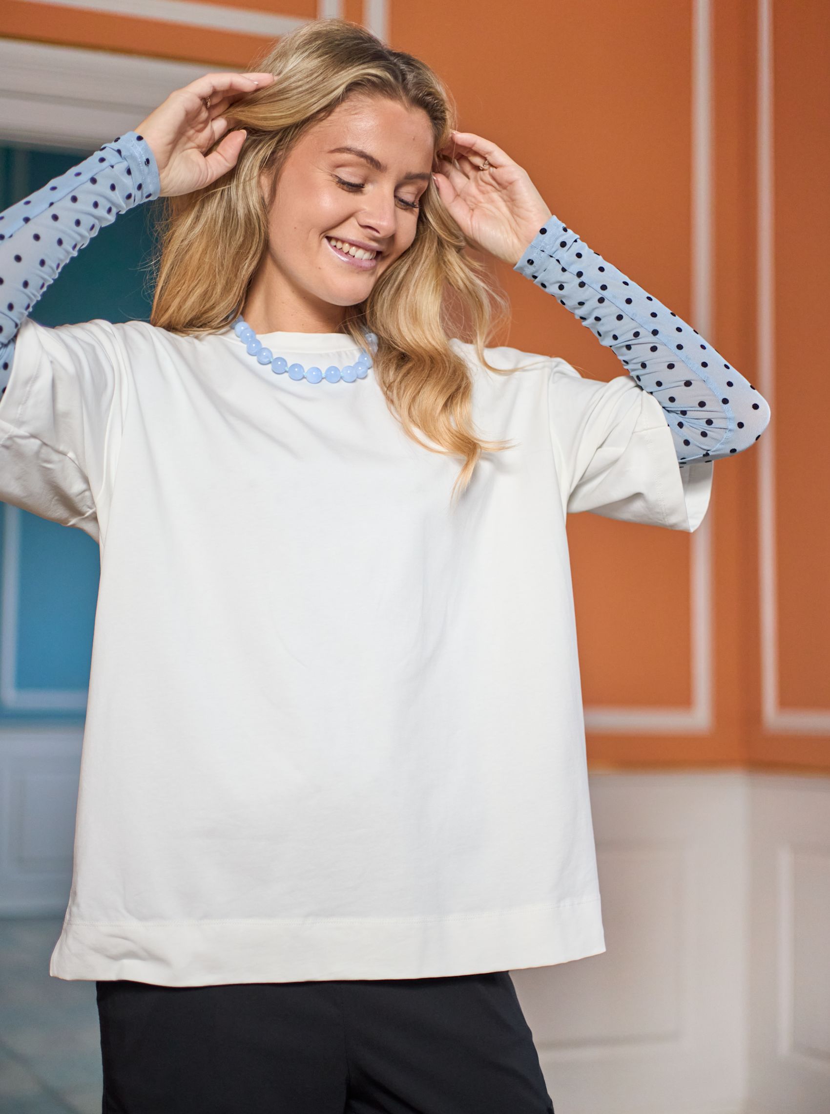 En klassisk oversize T-shirt med et afslappet og moderne snit. Modellen har rund hals, brede ærmer og en løs pasform, der giver et cool og ubesværet udtryk. Derudover har den en lille brodering af vores BC logo i nakken. Det bløde materiale gør T-shirten ekstra behagelig og perfekt til hverdag og afslapning.